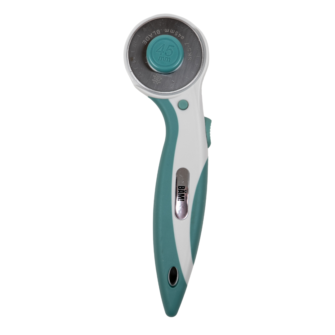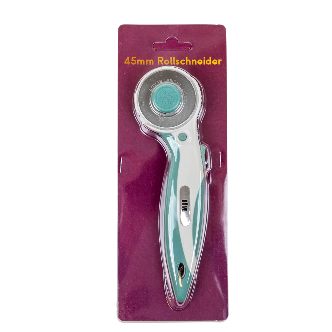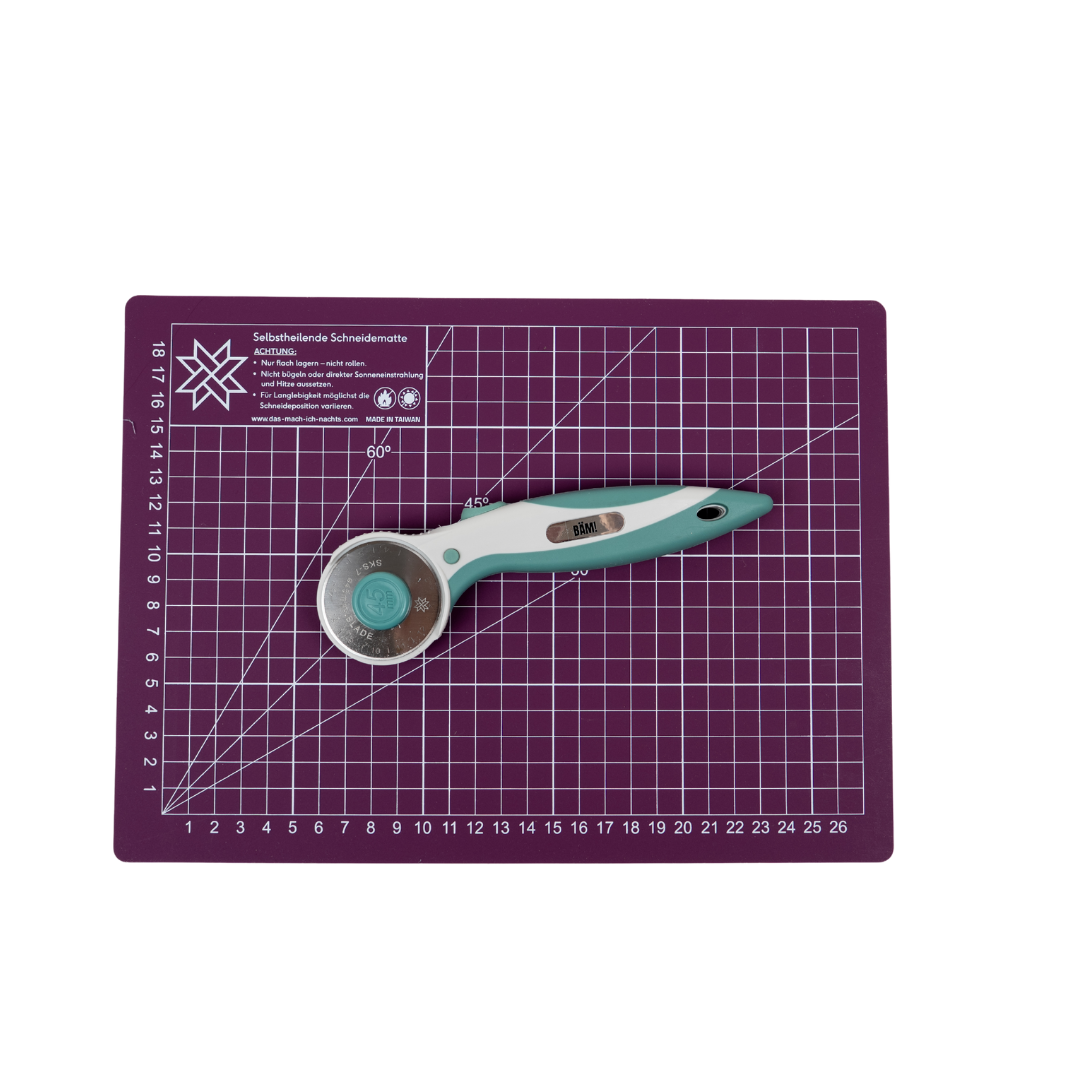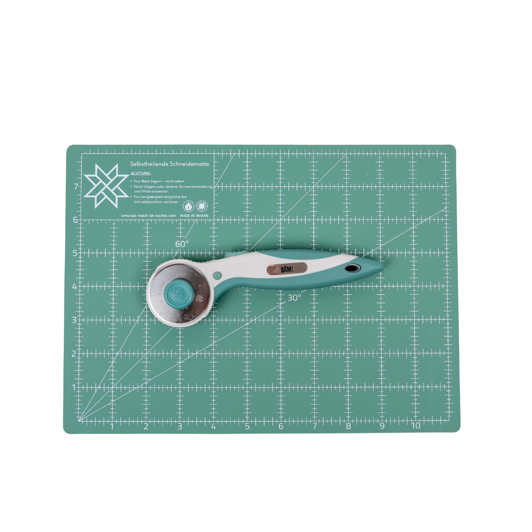 Der Rollschneider lässt sich von Rechts- und Linkshändern gleichermaßen benutzen. Gestaltet von Das mach ich nachts, mit einem hübschen Quiltstern auf dem Messer und einem „BÄM“ Schriftzug auf dem Griff. Passend zur Schneidematte von Das mach ich nachts.