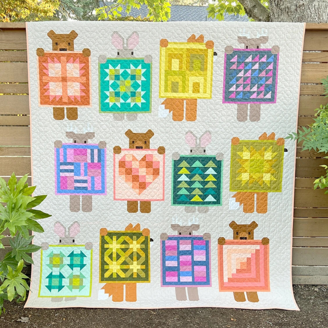 Wer liebt es nicht, einen wunderschön fertigen Quilt zu präsentieren? Show and Tell ist eine Hommage an dieses Gefühl! Dieser Patchwork-Quilt zeigt Füchse, Hasen, Rehe und Bären, die jeweils einen anderen Mini-Quilt hochhalten.